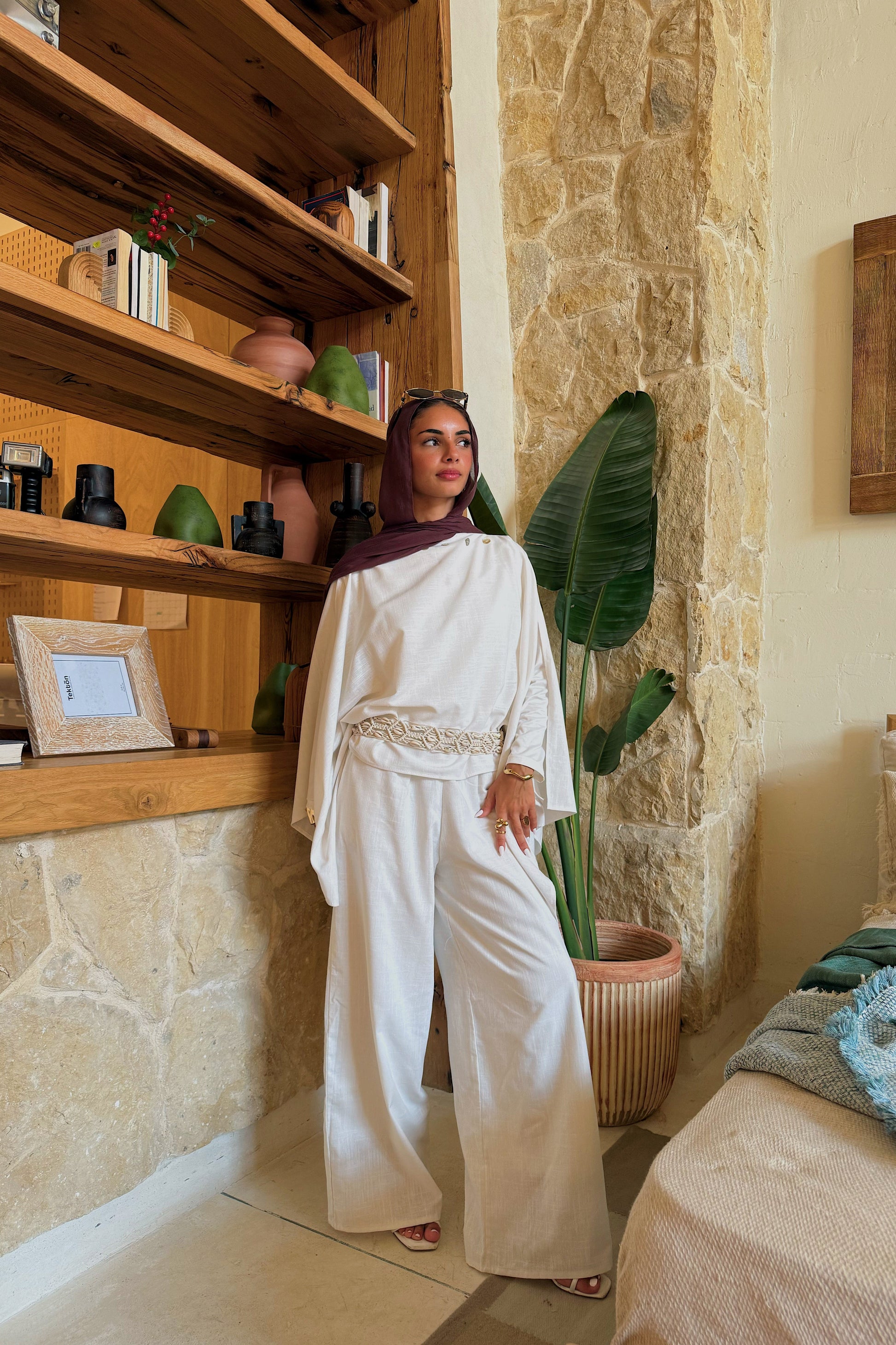 Our Luna cape is crafted from a breezy linen blend, shaped with intention and quiet structure. A line of delicate pearls traces the front, adding softness to its sharp, asymmetrical cut — a contrast we adore.