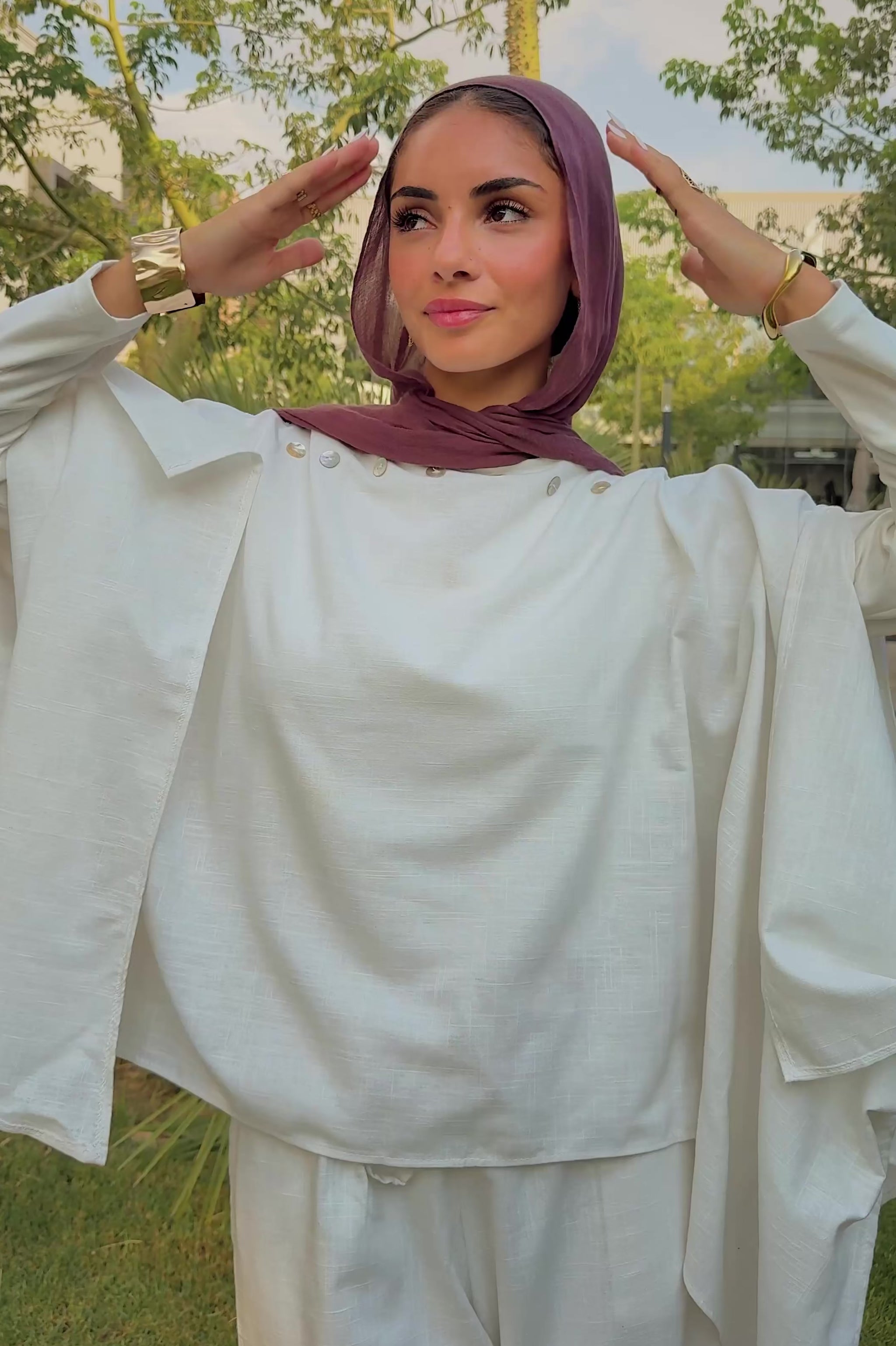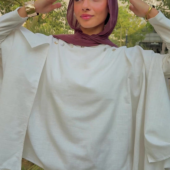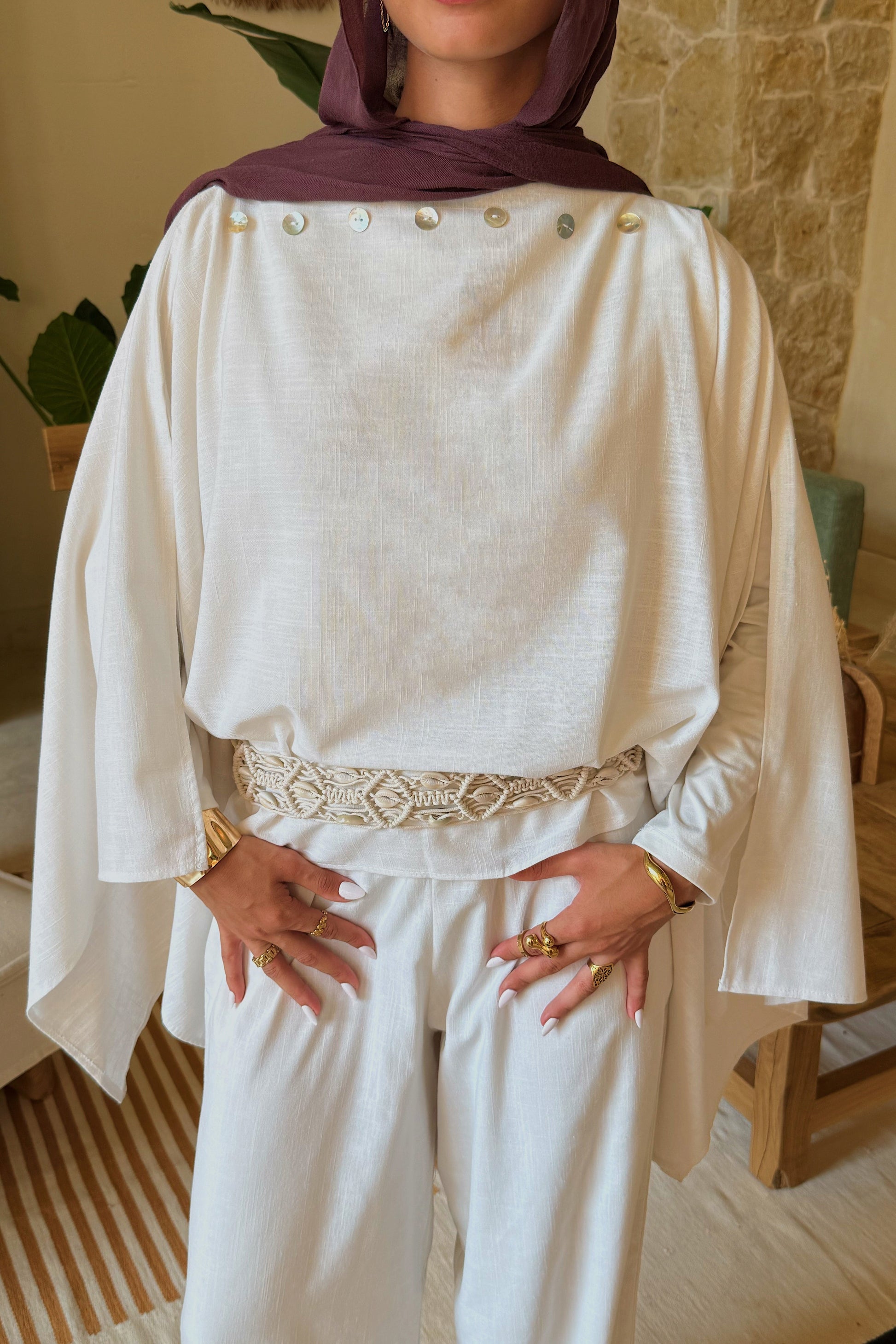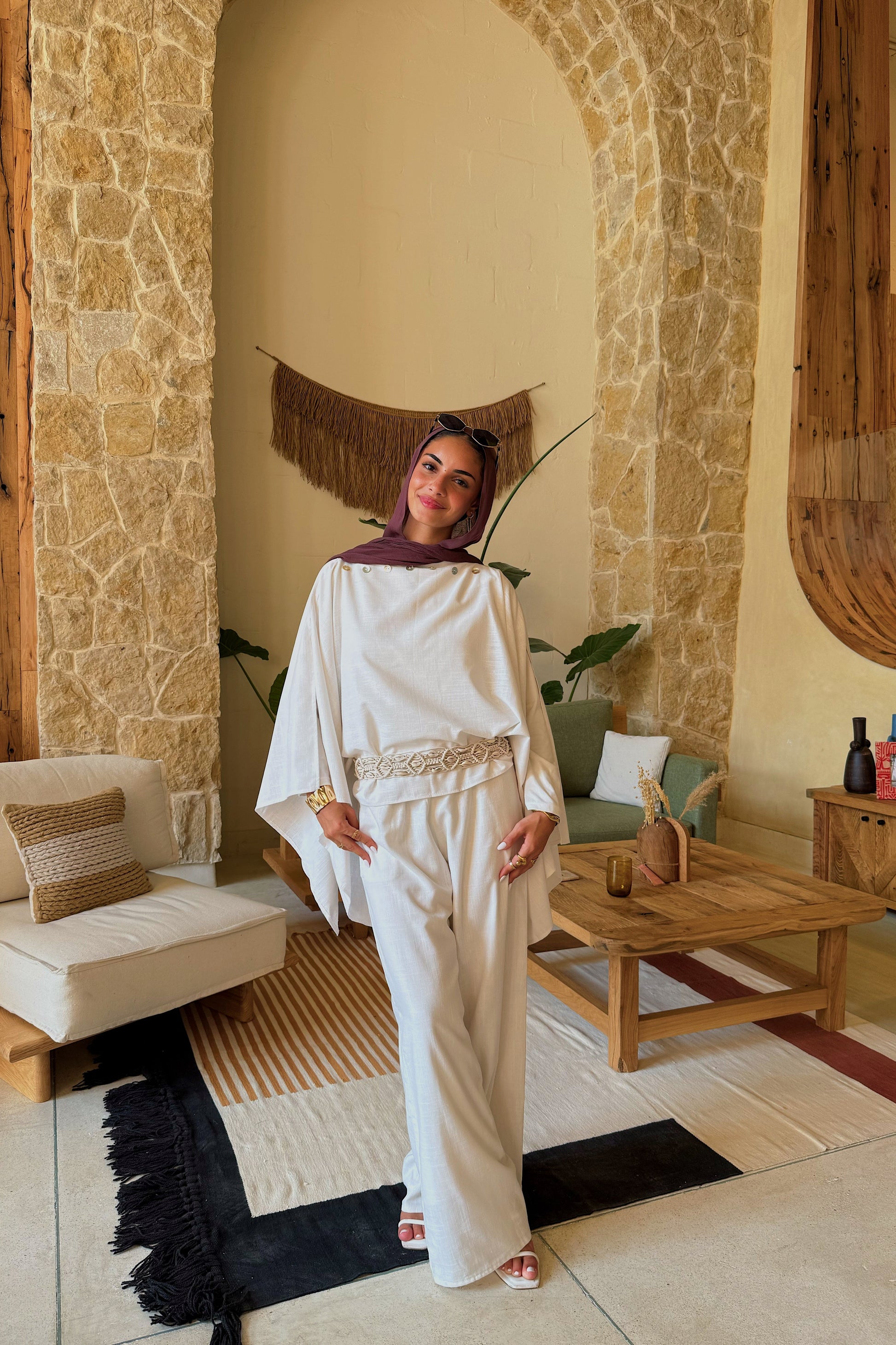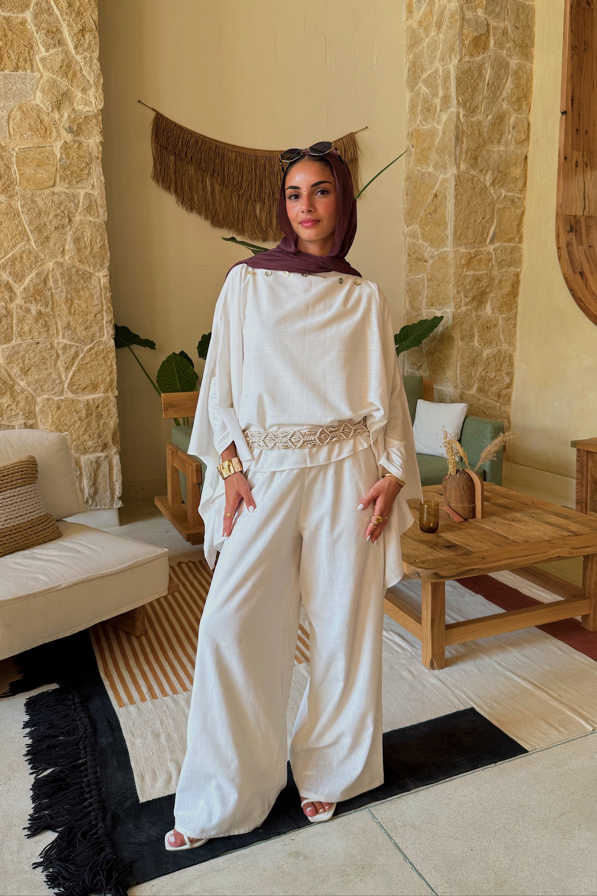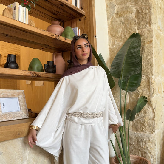 An ice-white linen-blend set: the pearl-trimmed Luna Cape and wide-leg Léa Pants with pockets and adjustable waist — effortlessly sharp yet soft.