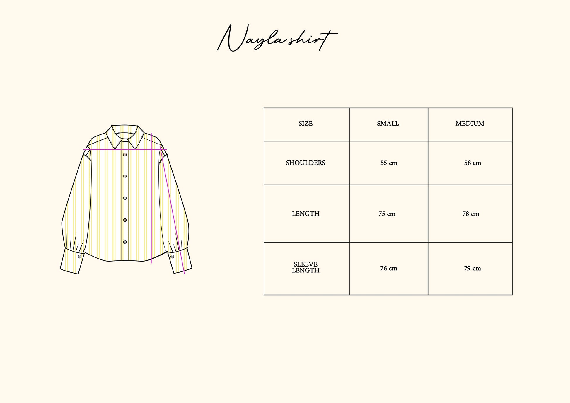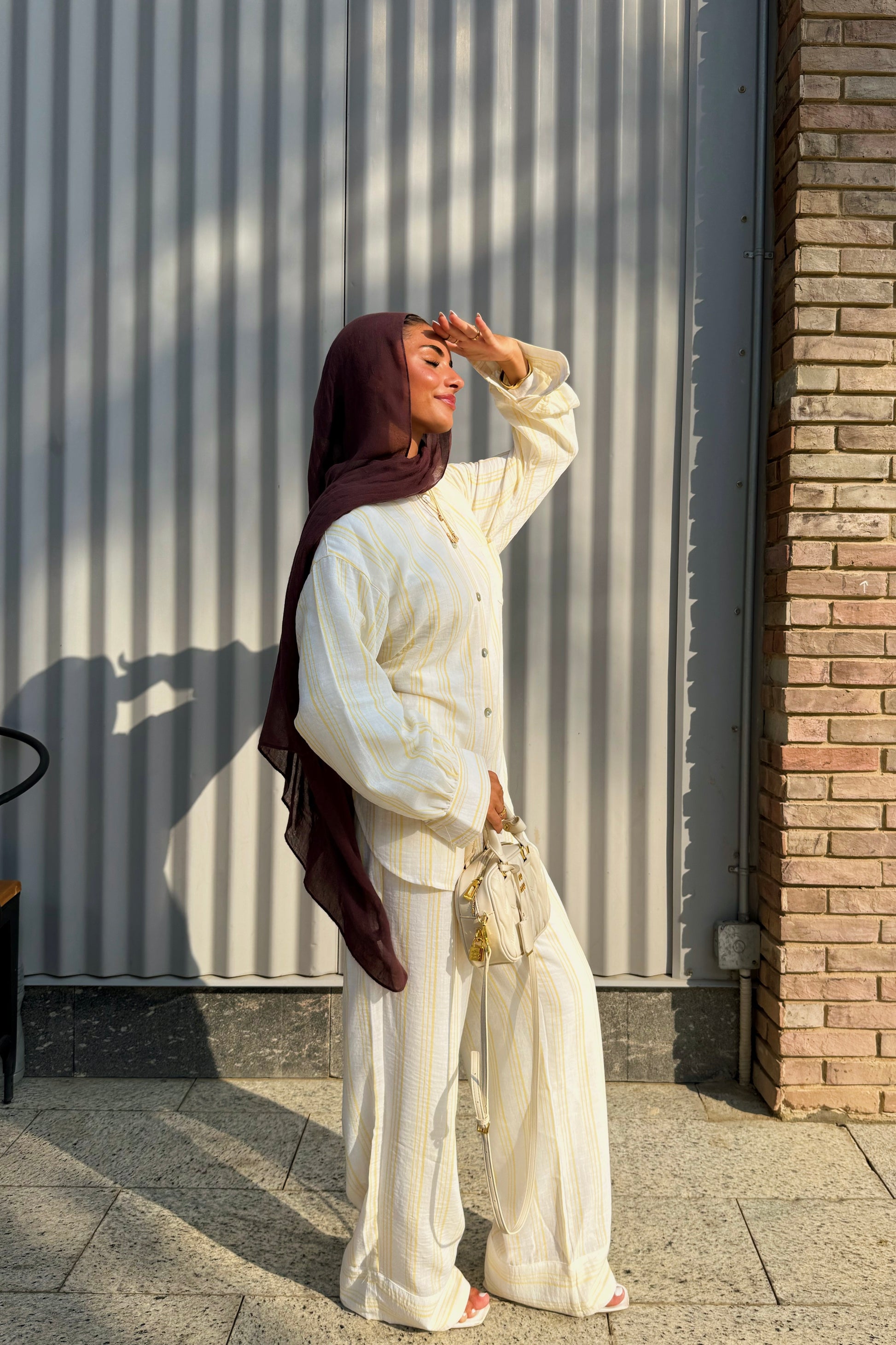 A lemon-yellow striped set: the Nayla Shirt with pearl buttons, puffed sleeves, and tie-back belt, paired with wide-leg Lana Pants with playful hem — effortless comfort with refined details.